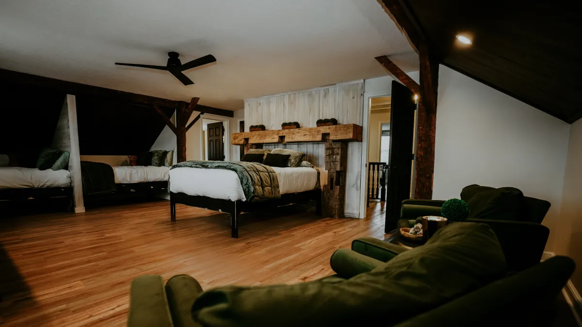 The front portion of the barn & loft area are designed with your comfort in mind, offering a calming atmosphere perfect for relaxation.